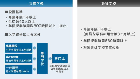 専門学校として正式に認可されるには「専修学校設置基準」において修業年限1年以上、生徒数40人以上、年間800時間の授業の他、教員数や教員資格、校舎面積などのが定められており、これらをの基準を満たしていなければなりません。これに加え、医療や調理(衛生)等の分野の多くの専門学校では、卒業することで国家資格や国家試験受験資格を取得できるようになっており、これらの分野は厚生労働省等、各分野における所轄官庁によって、教員資格や施設・設備、カリキュラム等に至るまで細かく定められた規定をすべてクリアしている必要があります。